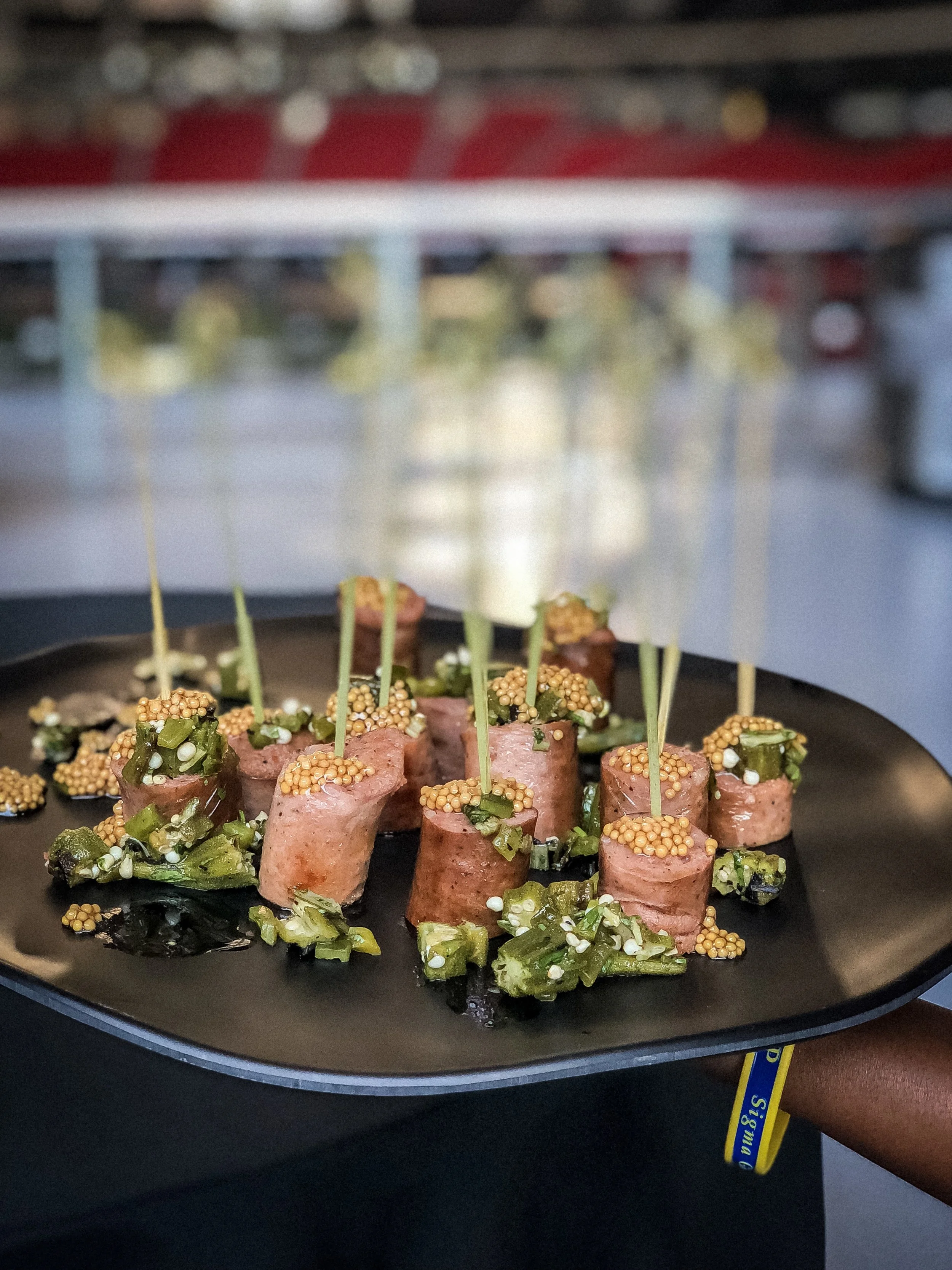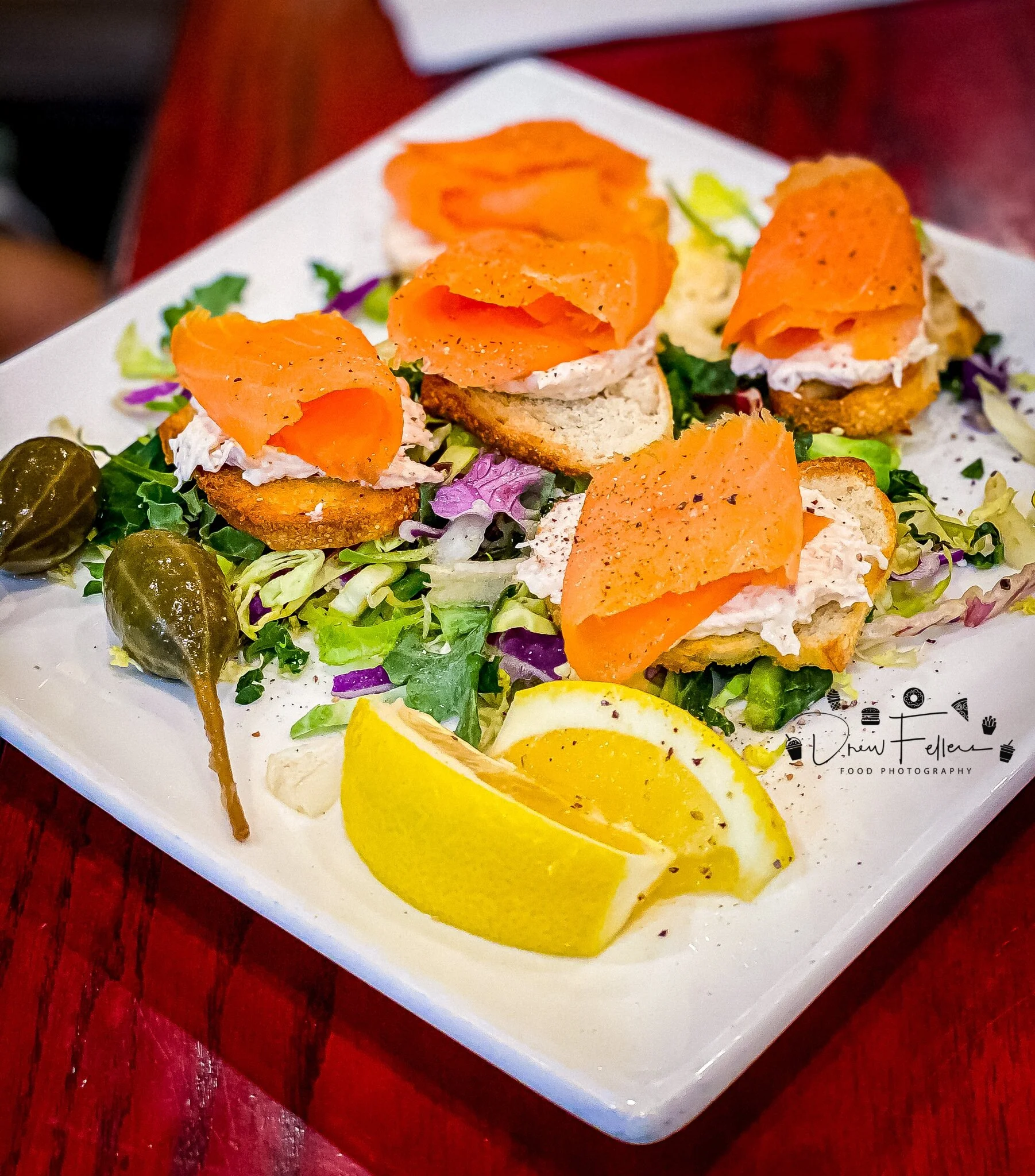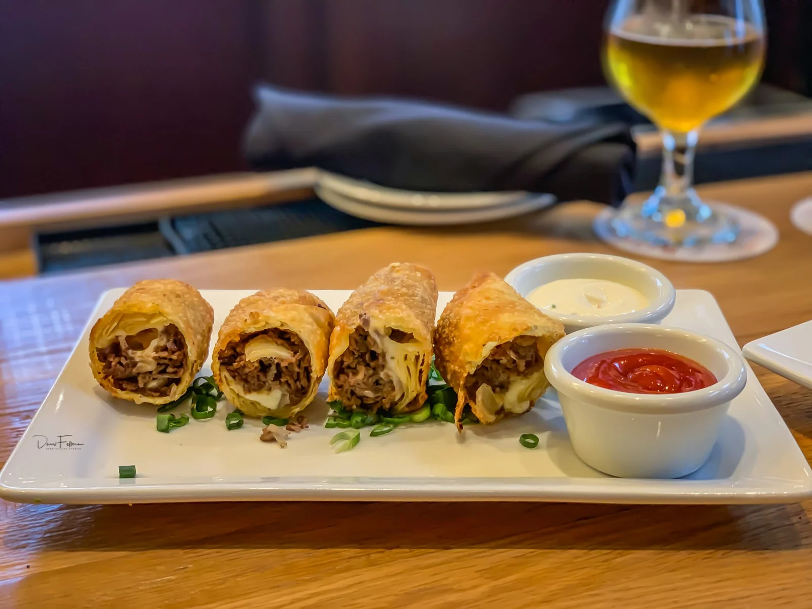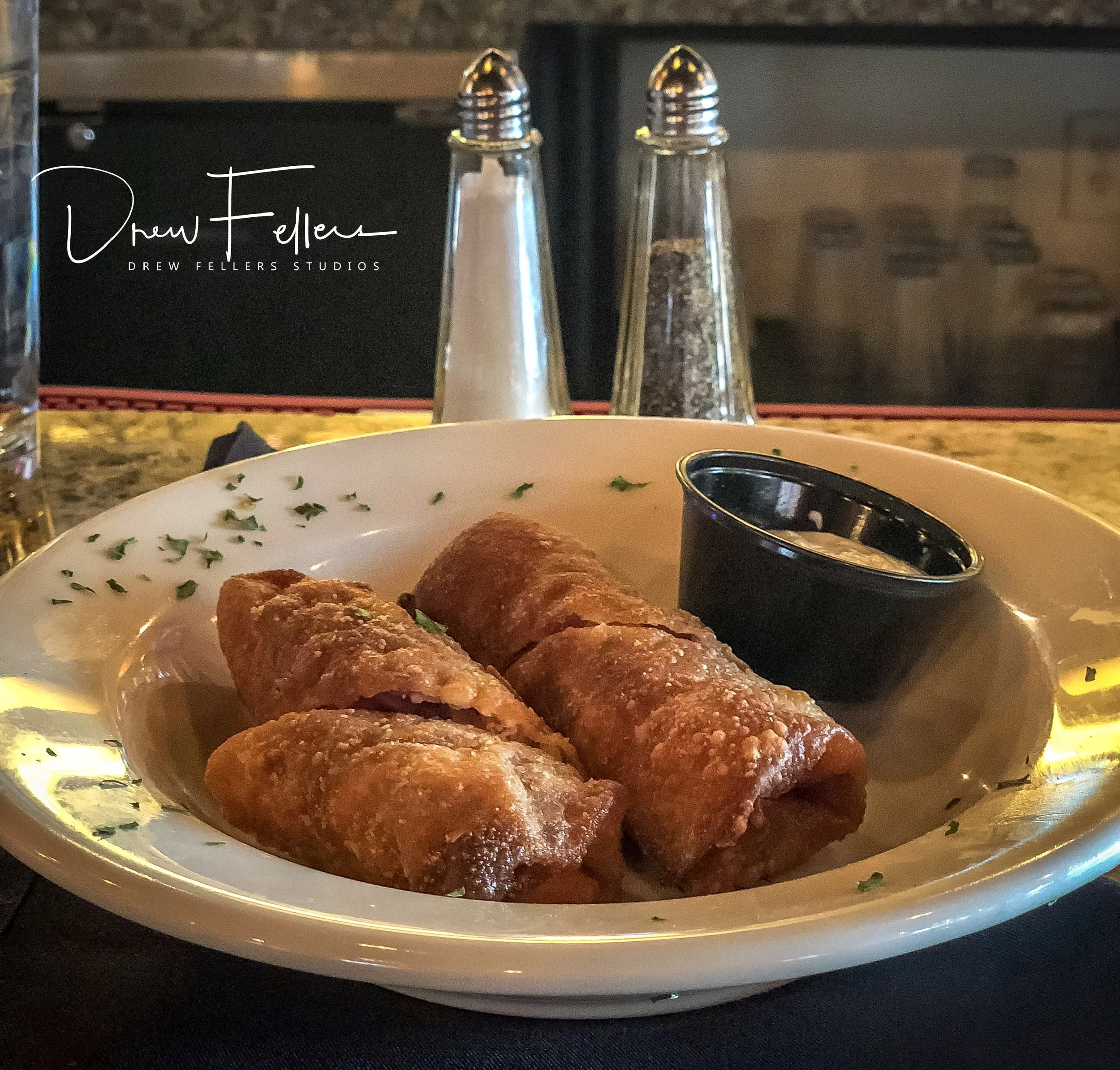 Of course when you partake in adult beverages, you also get hungry so we ordered appetizers… Philly Cheesesteak Egg Rolls, Salmon Spring Rolls,